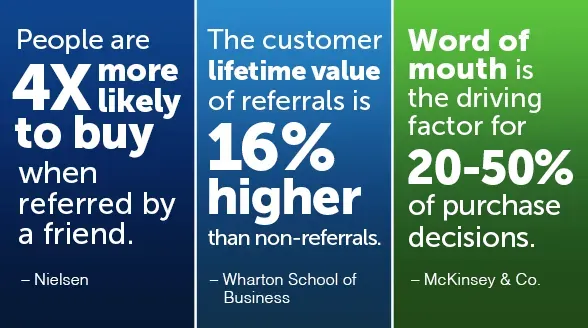 Unlike your standard web lead, which takes a lot of marketing dollars to get, referrals are a unique kind of new client. Because they’ve heard about you from a trusted friend or relative, half the battle has already been won. They take fewer marketing dollars and less energy to acquire, are more likely to buy from you and are more likely to remain with you as a client.